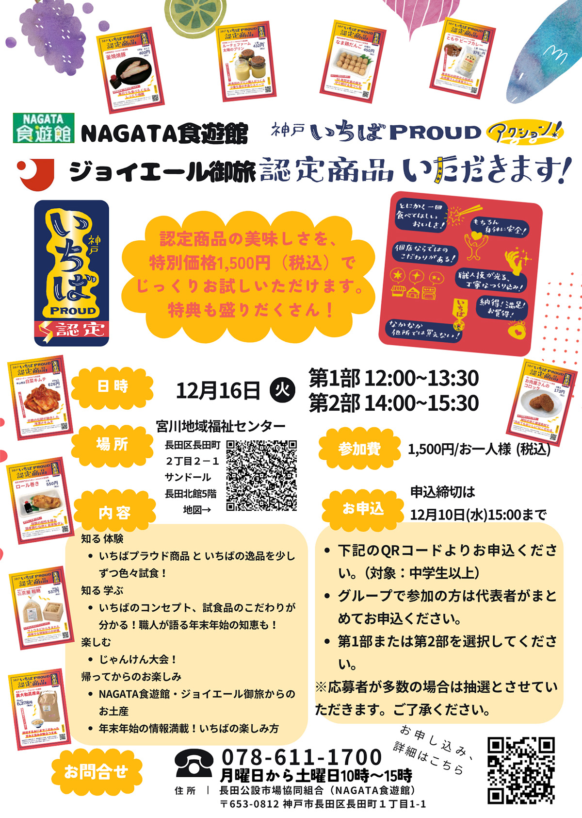 NAGATA食游館とジョイエール御旅が共同で、いちばPROUD認定商品やいちばの逸品を少しずつお試しいただく試食イベントを開催します。こだわりポイントの解説やプレゼントの当たるじゃんけん大会も!詳しくはチラシをご覧ください。